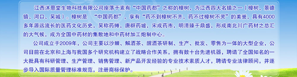 江西沐恩堂十年磨一劍,公司自成立以來,始終秉承“以人為本”的企業(yè)宗旨,遵循“專業(yè)、求實、創(chuàng)新”的企業(yè)理念,全力為消費者生產(chǎn)綠色、天然、健康的產(chǎn)品。